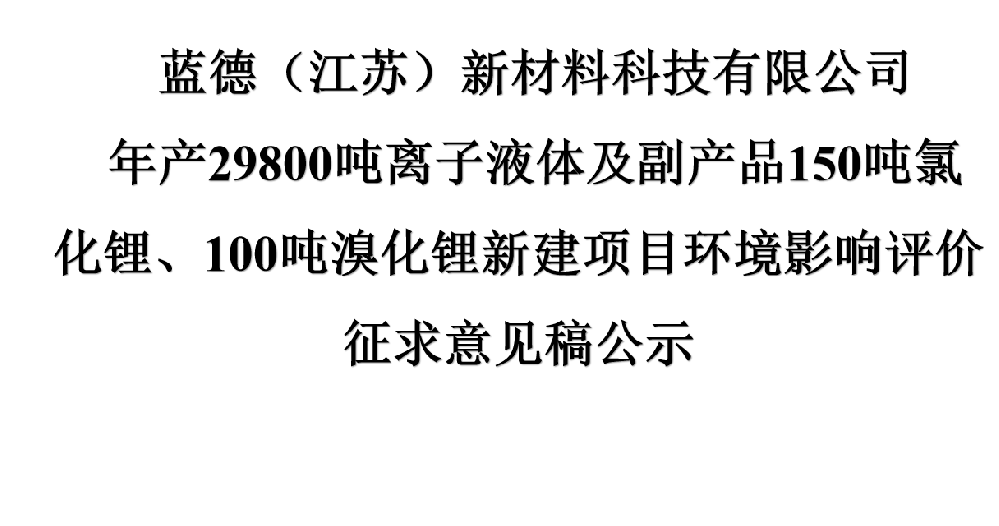 藍(lán)德(江蘇)新材料科技有限公司 年產(chǎn)29800噸離子液體及副產(chǎn)品150噸氯化鋰、100噸溴化鋰新建項(xiàng)目環(huán)境影響評價(jià)征求意見稿公示